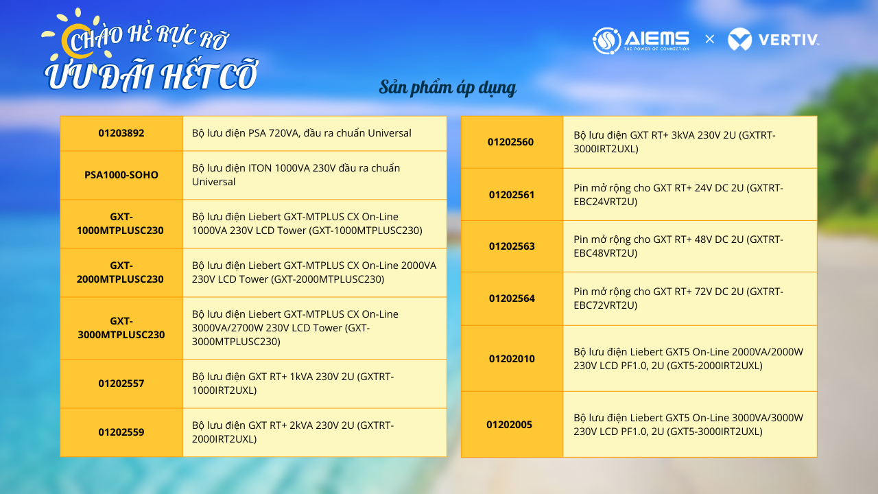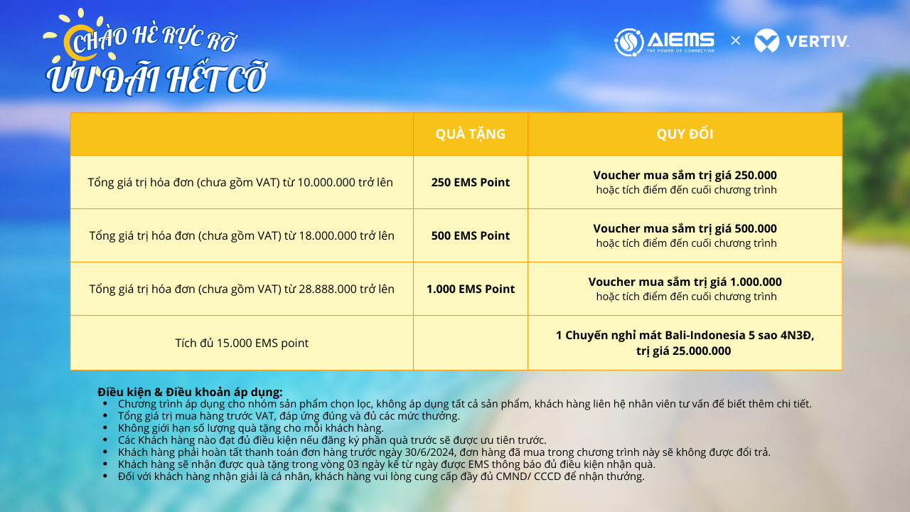 Công ty Cổ phần Công nghệ và Giải pháp EMS xin gửi đến quý khách hàng chương trình khuyến mãi “CHÀO HÈ RỰC RỠ - ƯU ĐÃI HẾT CỠ” cùng các sản phẩm Vertiv.