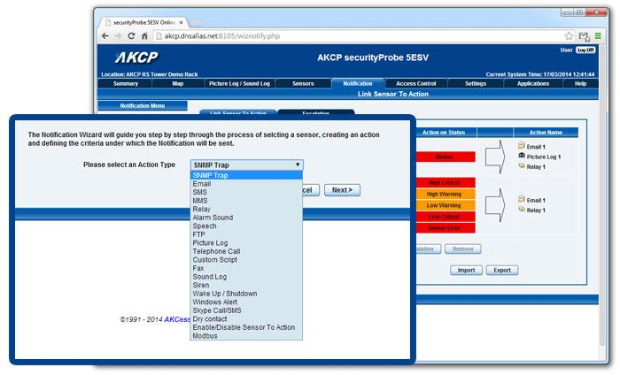 AKCP cung cấp một dải rộng các thông báo, không giới hạn ở email, bẫy snmp, các cuộc gọi điện thoại tự động và tin nhắn sms (khi sử dụng USB tùy chọn của AKCP hoặc modem nội bộ 3G). Tự động hóa thêm vào có thể được thực hiện như tắt một máy CRAC và ổn định nhiệt độ phòng máy chủ bằng hệ thống CRAC khác cho đến khi nhân viên bảo trì có thể giải quyết được sự rò rỉ nước. Thêm chuông báo động báo động để thu hút sự chú ý ngay lập tức tới nước được phát hiện trong các khu vực quan trọng của một trung tâm dữ liệu.