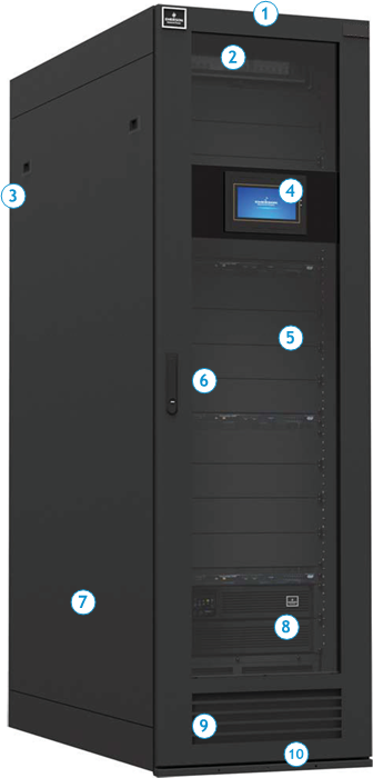 | 2. Bộ quản lý nguồn điện Bộ quản lý nguồn điện lắp sẵn (PMU)cung cấp MCB cho UPS, thiết bị làm mát, PDU, và mạch rẽ. Ngoài ra còn bảo vệ chống sốc điện cho tủ SmartCabinet™. |
