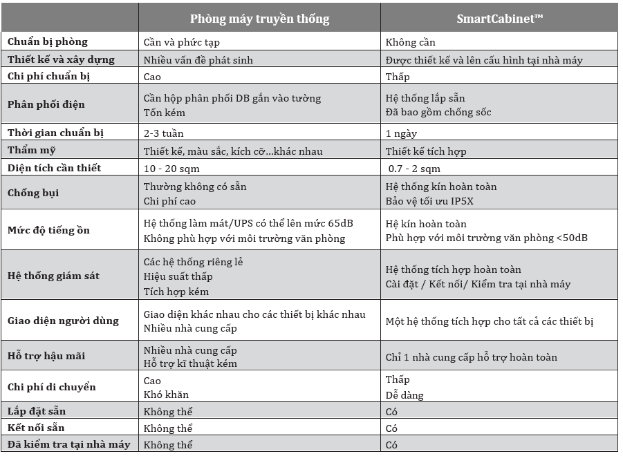 - Triển khai nhanh – Tủ SmartCabinet™ cho phép triển khai nhanh hơn và sẵn sàng để sử dụng ngay từ ngày đầu tiên mà không cần phải xây dựng hay thiết kế các phòng máy riêng, nhờ đó rút ngắn thời gian so với việc thiết lập một hạ tầng CNTT truyền thống.