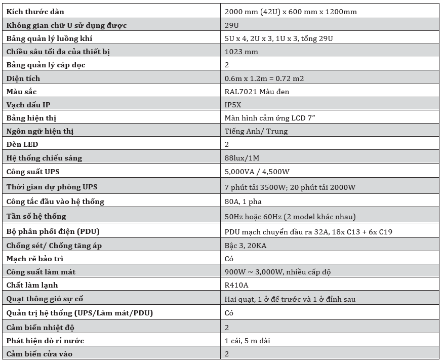 ĐẶC ĐIỂM VÀ TÍNH NĂNG NỔI TRỘI - Tích hợp đầy đủ - Hệ thống quản lý nhiệt, nguồn, vỏ, hệ thống phân phối điện và chức năng giám sát/quản lý, tính năng bảo mật các ứng dụng CNTT, tất cả đều được kiểm tra và lắp ráp tại nhà máy. Không yêu cầu phòng CNTT chuyên dụng.