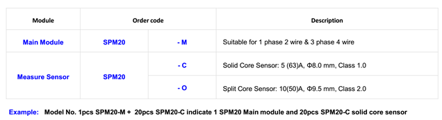 Ví dụ: 1 pc SPM20-M và 20 pcs SPM20-C biểu thị 1 chiếc SPM20 main module và 20 chiếc SPM20-C cảm biến kín